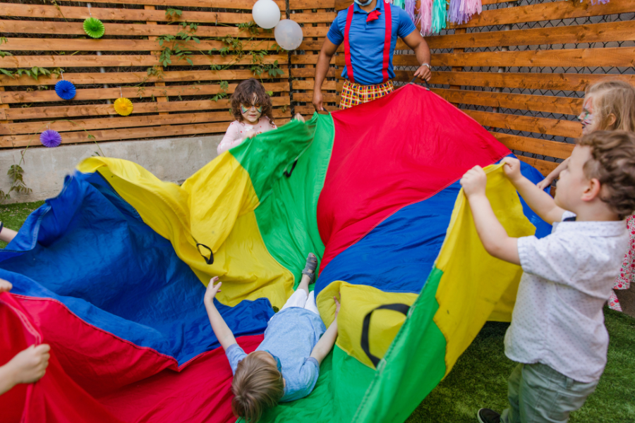 - Taniec z chustą animacyjną – dzieci chwytają za chustę, poruszają nią zgodnie z rytmem muzyki, wykonując różne zadania.